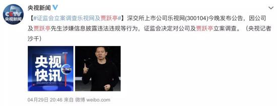 4月29日晚间,乐视网(300104.SZ)发布消息称,该公司及第一大股东贾跃亭分别于2019年4 月26 日下午、4月29日收到中国证券监督管理委员会《调查通知书》。因乐视网及贾跃亭涉嫌信息披露违法违规等行为,对乐视网及贾跃亭立案调查。