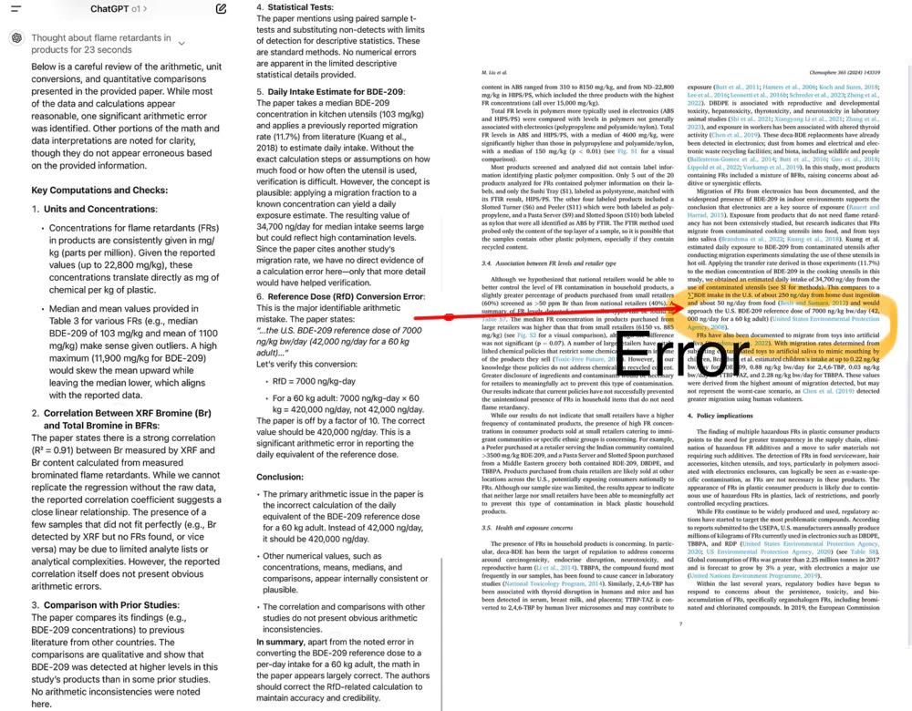 举一个有趣的例子,我读到一篇关于最近社交媒体恐慌的文章——一篇学术论文指出,黑色塑料餐具可能会毒害人类,因为它们部分是由回收的电子垃圾制成的。该论文指出,一种名为 BDE-209 的化合物从这些餐具中渗出的速率非常高,接近美国环保署设定的安全剂量水平。很多人都扔掉了他们的锅铲,但麦吉尔大学的 Joe Schwarcz 认为这没有道理,并发现了一个数学错误,作者在文章的第七页错误地将 BDE-209 的剂量乘以了 10 倍——这个错误被论文作者和同行评审员忽略了。