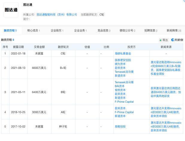 天眼查 App 信息显示,图达通至今完成了五轮融资,投资方包括高榕创投、蔚来资本、淡马锡、BAI 资本、愉悦资本、顺为资本、斯道资本、国泰君安创投等。