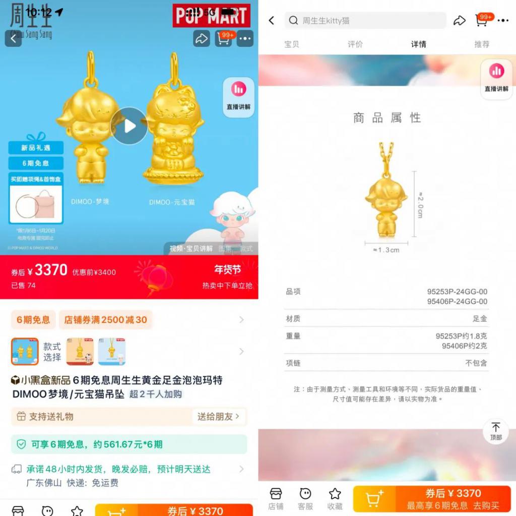 据猎云网在天猫上搜索发现,周生生黄金足金泡泡玛特 DIMOO 梦境 / 元宝猫吊坠单颗售价 3400 元,足金约 1.8 克 /2 克,单算下来也达到了 1700 元 / 克,是 1 月 15 日周生生 812 元 / 克金价的超 2 倍。