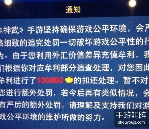 12月21日晚,部分玩家在登陆手游《神武》后看到一个特殊的弹出公告,大意是该账号因利用外汇价值差异牟利而受到停封处罚,只有再次充值偿还相应差价后,才能继续正常游戏。并且公告还警告玩家“若今后再有类似情况,会有严厉的额外处罚”。其具体规则是:“从12月1号开始,从淘X黑市卖家那充的黑元宝累计额的20%,作为扣除额。”