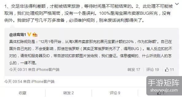 手游矩阵今日第一时间向多益网络的内部人员进行了联系,向其征询官方对此事件的具体表态,对方的回复是“看老徐(徐宥箴)的微博”。而在微博上,徐宥箴明确表示:“自己在国外自己充的(玩家),不会受影响,即使在俄罗斯(其实正常俄罗斯充不了,得用BUG)。有人反应扣的不对的,请告知服务器及ID,带自游戏扣款额图片发给我,我们查证。信息模糊的、什么听说别人的怎么的,一律不理。”